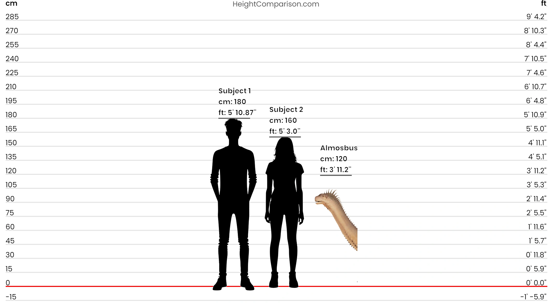 The almosbus possesses thick bodies with box-shaped scales not seen on typically any other extant reptile. Similarly to their ancestors, sauropods, almosbus' have extremely long necks with both their necks and throats being laced with extremely sharp spikes which can reach up to 20 centimeters. Almosbus' have extremely thick, bulky legs each laced with three toes with a unique foot pattern for each footprint. The almosbus does not possess any teeth, like most reptiles, however they do have small bone-like architures they use to chew flesh and leaves. On average, almosbus' have the length of 120cm (3' 11.2" ft.), making them the longest species of reptile in length, but one of the smaller ones in size.
