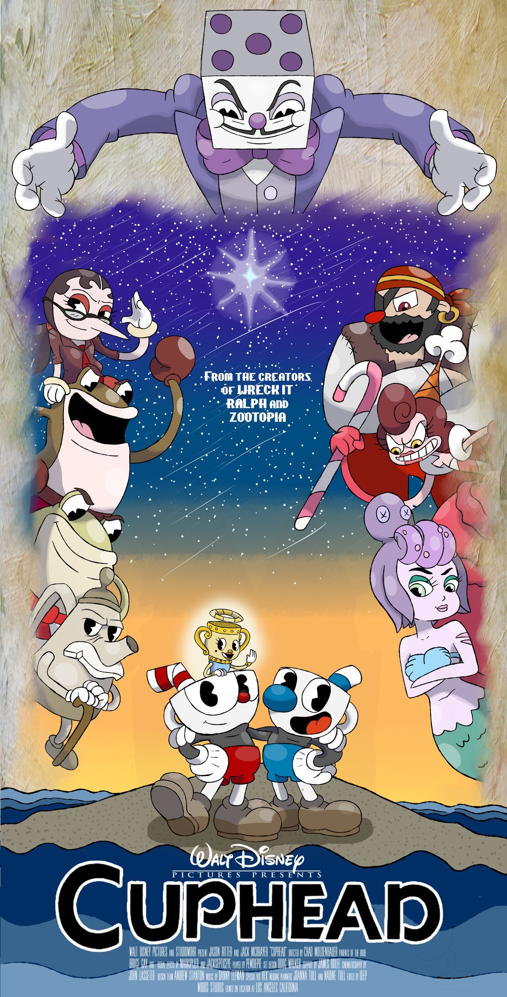 Cuphead is a 2018 American animated comedy film based on the run and gun indie video game of the same name. It was directed by Chad Moldenhauer and Jared Moldenhauer and written by Evan Skolnick.The Movie was Produced by the Debut of MoldenHauer Bros. Pictures and Walt Disney Animation Studios.[3]The film features the voices of E.G. Daily, Nancy Cartwright, Alana Bridgewater, Grey Griffin, Partick Stewart, Katie Soucie, Mandy Moore, and Jeremy Irons.